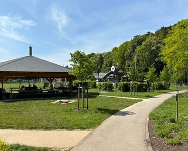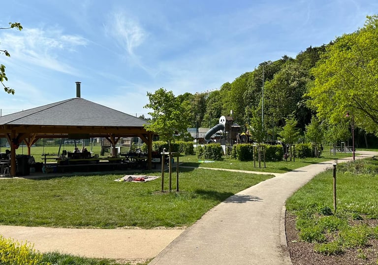 Helyszín: Grillplatz, mellette padok, asztalok, kis tó, zöld terület, füves focipálya stb.